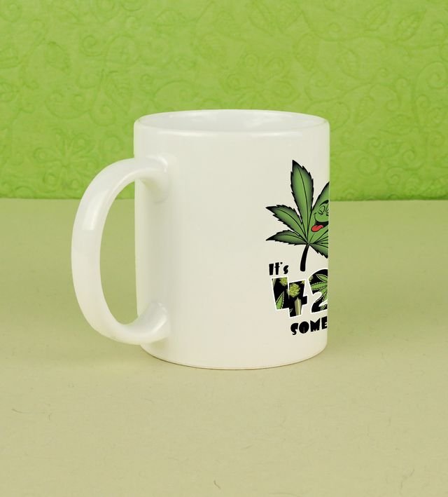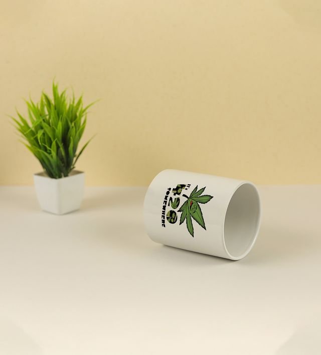 Start your day with a burst of vibrant energy! This printed coffee mug features a psychedelic leaf artwork surrounded by colorful flame-like patterns