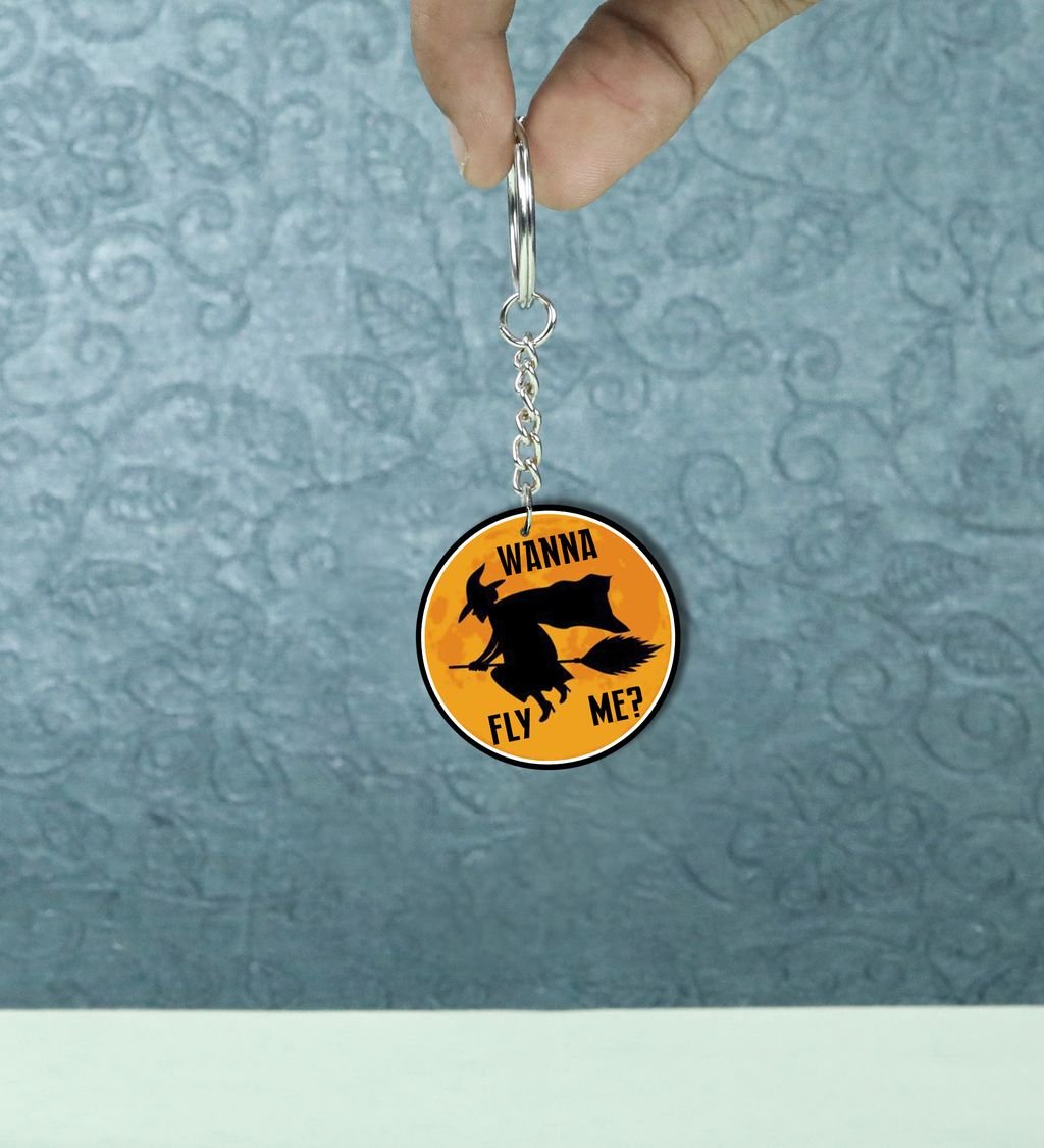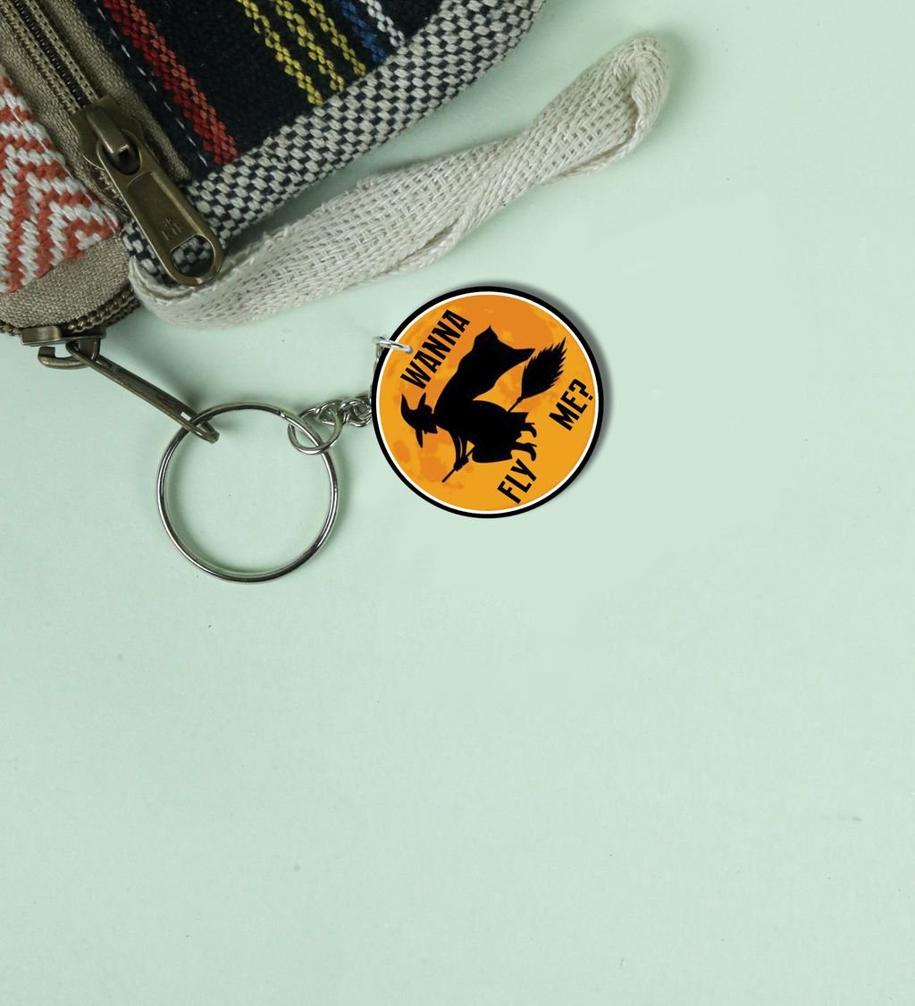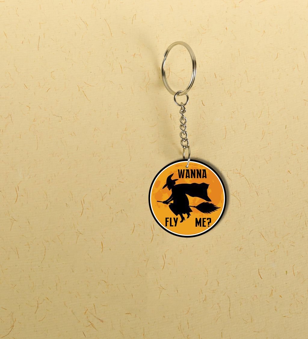 Bright Halloween Flying Witch Design Printed Round Keychain Pack of 2