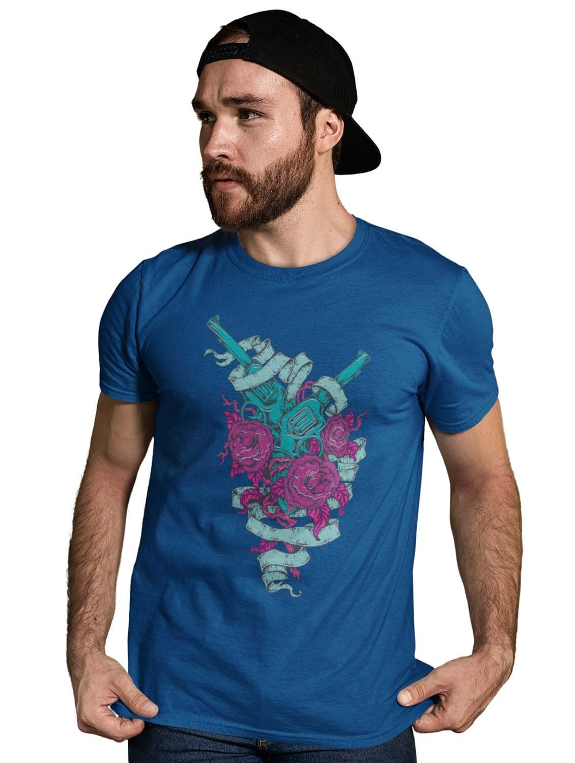 The Shooter And Roses Blue Round Neck Cotton Half Sleeved T-Shirt with Printed Graphics
