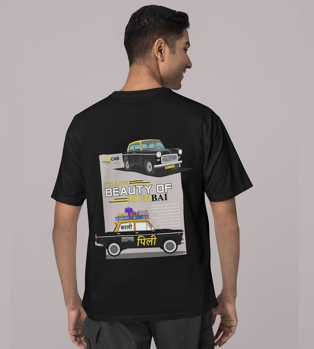 Beauty of Mumbai: in Yellow Black Taxi Graphic Printed Black T-Shirt