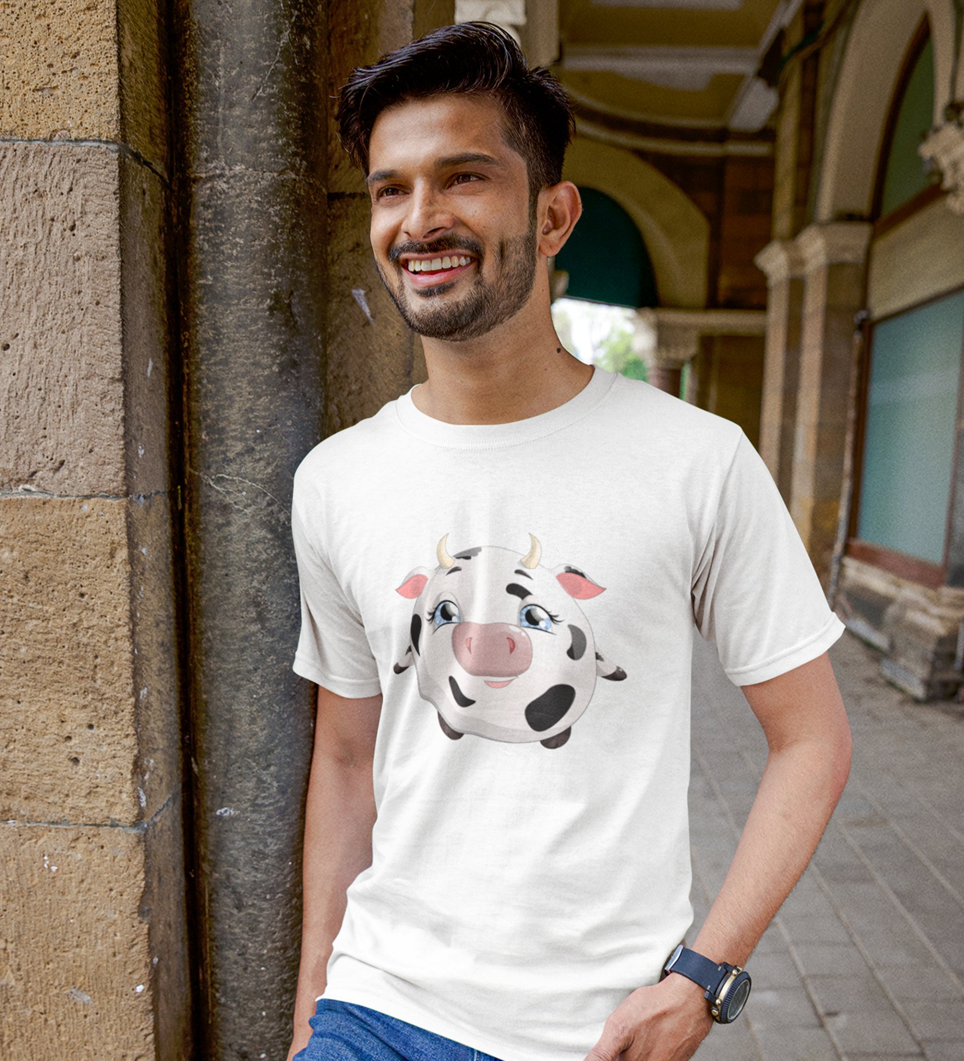 Baby Moo White Round Neck Cotton Half Sleeved Men's T-Shirt with Printed Graphics