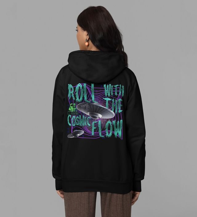 Cosmic Adventure Space Ship Roll with Cosmic Flow Black Cotton Printed Hoodies For Women