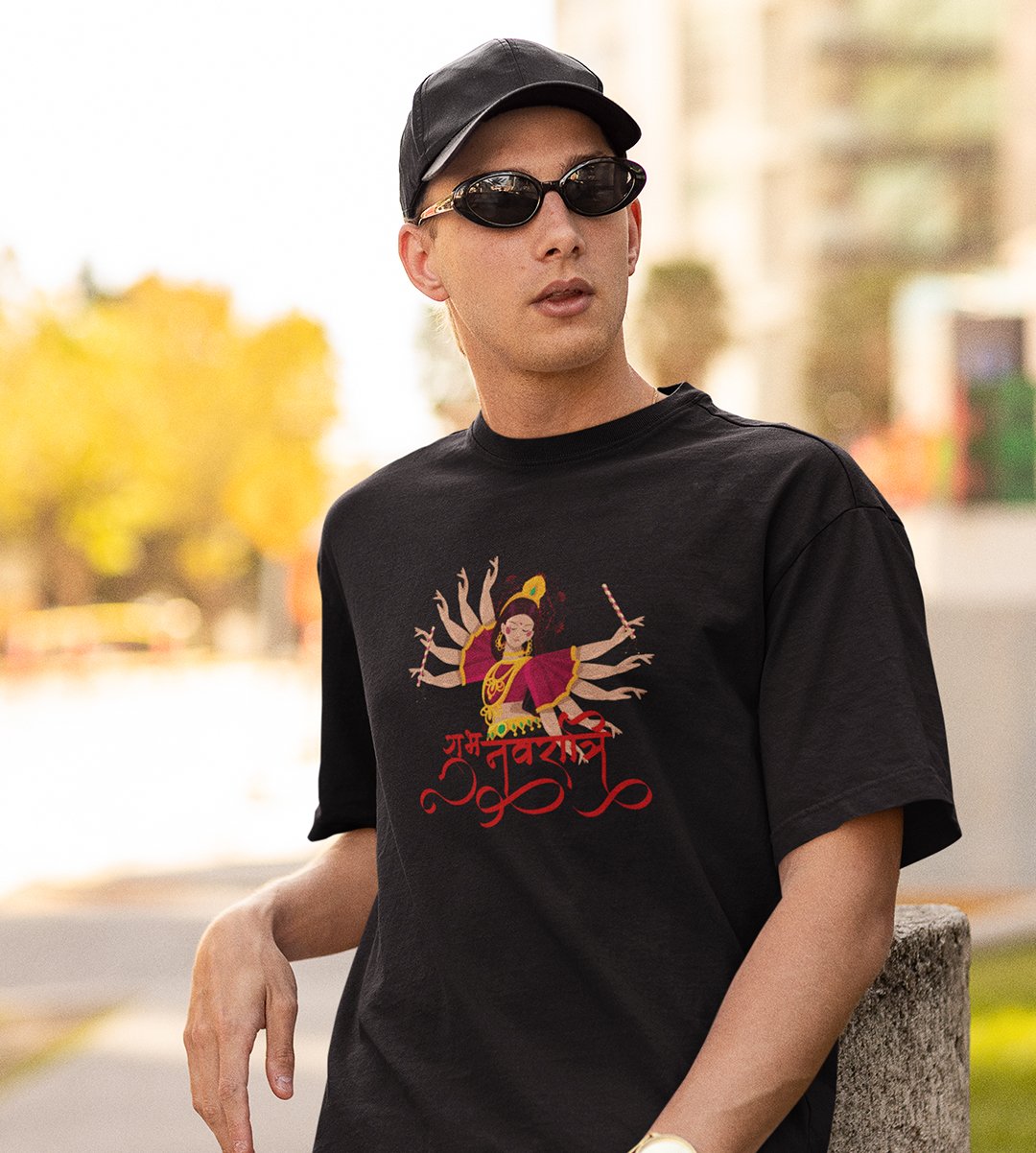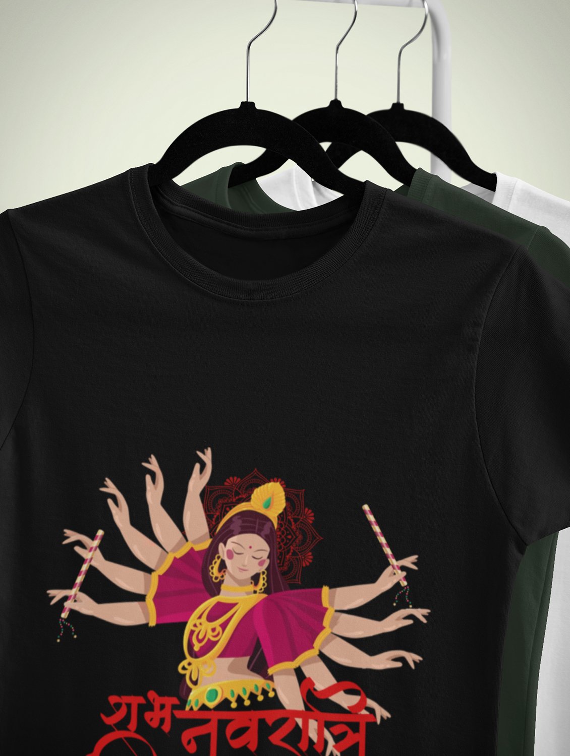 Navratri is a very auspicious festival for hindus. It takes place at the beginning of October and sometimes September. Enjoy the 9 days of festivities with full zeal and make yourself submerged in the love of Maa Durga. Navratri is also known as Durga Puja. And with this Tees, you can shine like a star during this festive season with our navratri themed cotton half sleeved Tshirts. You can pair our t-shirts with trousers and denim of your choice and make it a weekday smart casual or weekend wear. This is durable. This tshirt is smooth and soft which makes you comfortable to wear during all seasons. The printing in it is durable and odourless. It has five sizes, S,M,L,XL,XXL. The Tshirt colour is intact even after repeated washes. It can be kept in your wardrobe and hangers. Please avoid washing mashine to clean this Tee, it may affect the print. Hand wash only. We have brought you many navratri related designs printed on our different colour Tshirts to choose from. Grab it now.