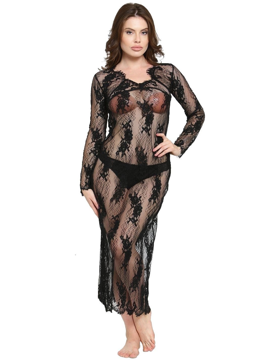 For a well-planned night, this gown is very lovely to make your intimate lover cheer up for your alluring silhouette. this mesh gown with lace detail waistline enhancing you a curve, scalloped lace V-neck on both front and back, flirty split to the thigh and thong matched. Mesh Nightgown Highly Comfortable Includes: Nightgown, G-String
