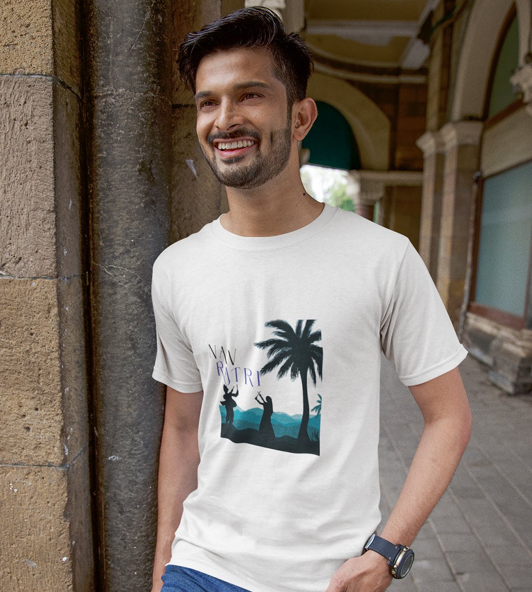 Navratri (trees) printed unisex adults round neck cotton half-sleeve white tshirt specially for Navratri festival/ Durga puja