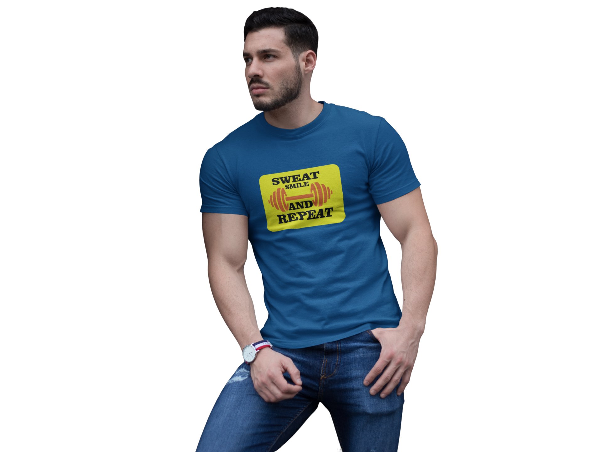Sweat, Smile And Repeat, (BG Yellow), Round Neck Gym Tshirt (Blue Tshirt) - Clothes for Gym Lovers - Suitable for Gym Going Person - Foremost Gifting Material for Your Friends and Close Ones