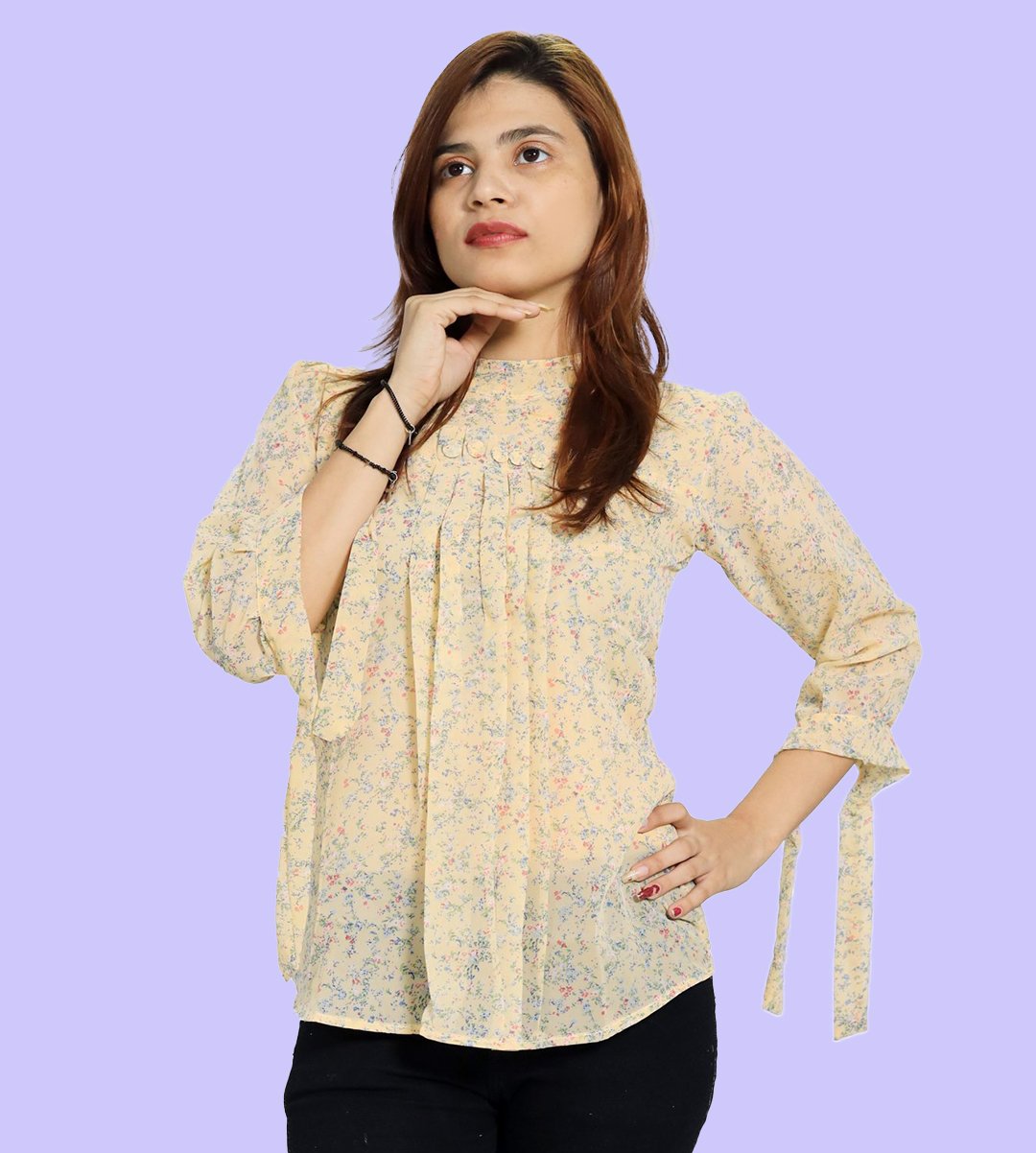 Women loves to wear top of any age groups. The fashion is not only limited upto young girls / teenagers but some married women also love to wear it. The recognization of top is very much popular in 21st century. It is used by the modernized ladies. Easy to wear. It looks good with jeans or jeggings. We have brought you a full collection of floral designs printed top to choose from. This is made up of Rayon and designed for your plesant and cozy.